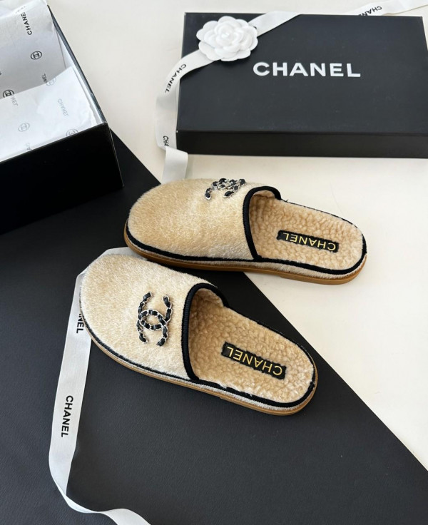 샤넬 체인 CC 로고 시어링 스웨이드 뮬 슬리퍼